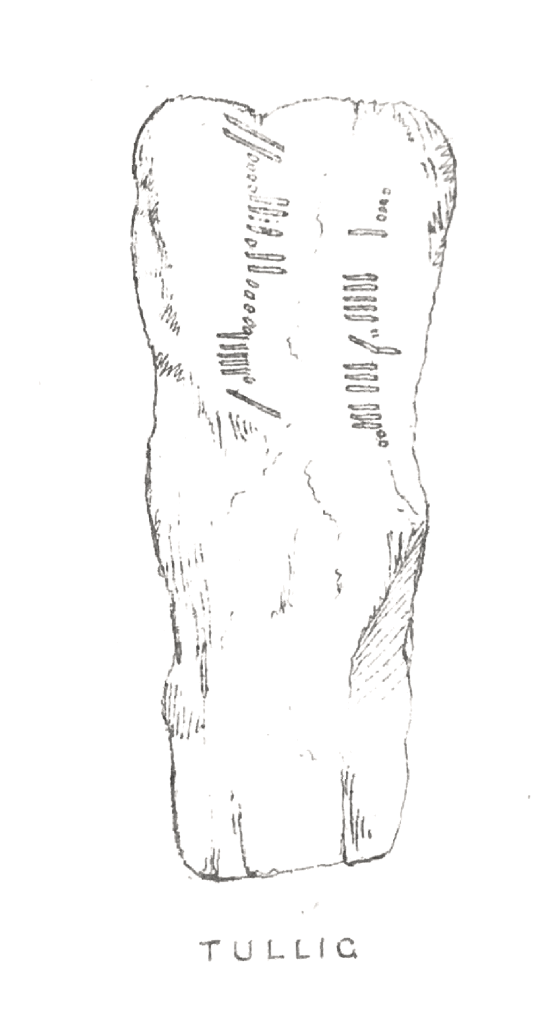 After being taken to Cork, the ogham stone was examined by local antiquarian and archaeologist Richard Rolt Brash (1817-1876). He described it as a rough, undressed pillar of old red sandstone, which was fractured and weather-worn. Reading the inscription, Brash questionably concluded the left angle to read MAQI LASEG (‘the son of Laseg’) with a possible name before Maqi, which was now unreadable; and the right angle to read OT MAQ (I) HE (‘Ot the son of He’). By 1932, Patrick Power was describing it as a 5ft x 1 ft 6in pillar with well-cut scorings, but difficult to interpret and he read the inscription as EGSAMVVA MAQI LASCOG [I]. Robert Alexander Stewart Maccalister (who took up Abell’s mantle of being an authority on ogham) in 1945 described Tullig More ogham stone as 5ft 2in x 1ft 9in x 1ft 6in, and of irregular shape due to ‘violent treatment’. He read the inscription as MAQILASPOG B TTMACDE, suggested letters could have been painted between B and TT to make BENEDICATT, and stretched his interpretation to read ‘may the Son of God bless Bishop Maqil’. Interestingly, Macalister also noted that an earlier inscription on the stone was gone, and the actual shape of the stone suggested part of the inscription had been on the base, which was partially buried when the stone was first discovered.