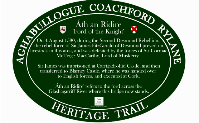 Áth an Ridire, translated as Ford of the Knight, is the meeting point of townlands (Carrigathou, Rockgrove and Shanavagha) and parishes (Aghabullogue and Aghinagh) north-west of Coachford village, within the heart of Muskerry and mid-Cork. This place name derives from an event which took place on 4 August 1580, when Sir James Sussex Fitzgerald of Desmond and his followers, who had been engaged in cattle raiding within the area, came into conflict with the MacCarthys of Muskerry, during the Second Desmond Rebellion (1579-1583). This skirmish is locally referred to as the ‘Battle of Mullinhassig’ and it was a considerable and bloody affair.