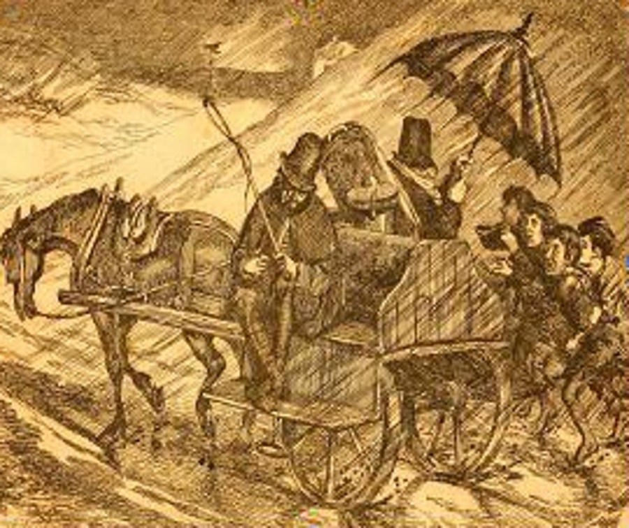 Image: An outside jaunting car in a storm (Daniel Maclise, 1836).